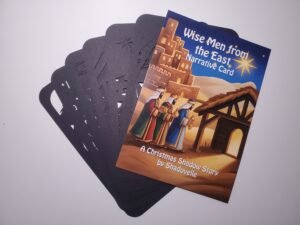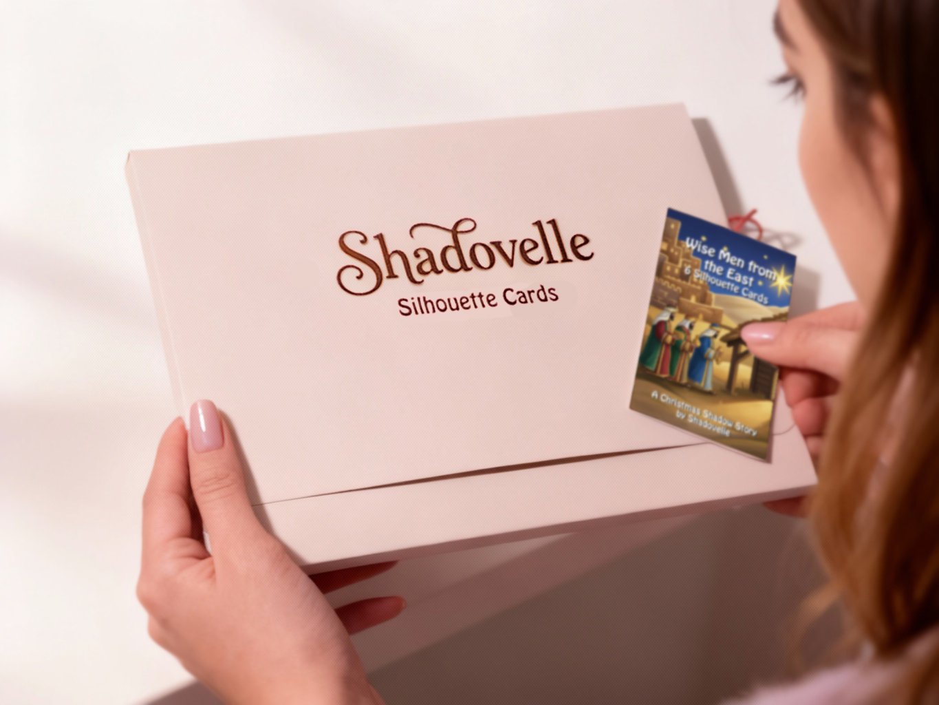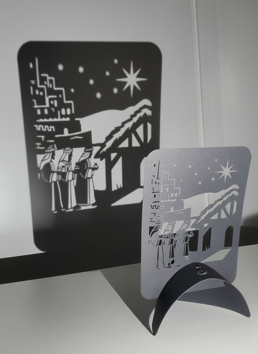 This silhouette card set captures their timeless journey — the glowing star above the desert, the caravan through the night, and the humble meeting at the manger. Each scene reveals itself through shadow and light, turning a familiar story into a quiet moment of reflection and wonder.